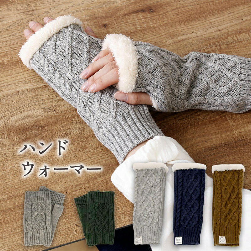 ハンドウォーマー 手袋 アームカバー ハンド ウォーマー ウール ケーブル編み ニット アームウォーマー レディース カジュアル お洒落 かわいい グレー ネイビー カーキ グリーン 防寒 ぽか活 指先 スマホ 対応