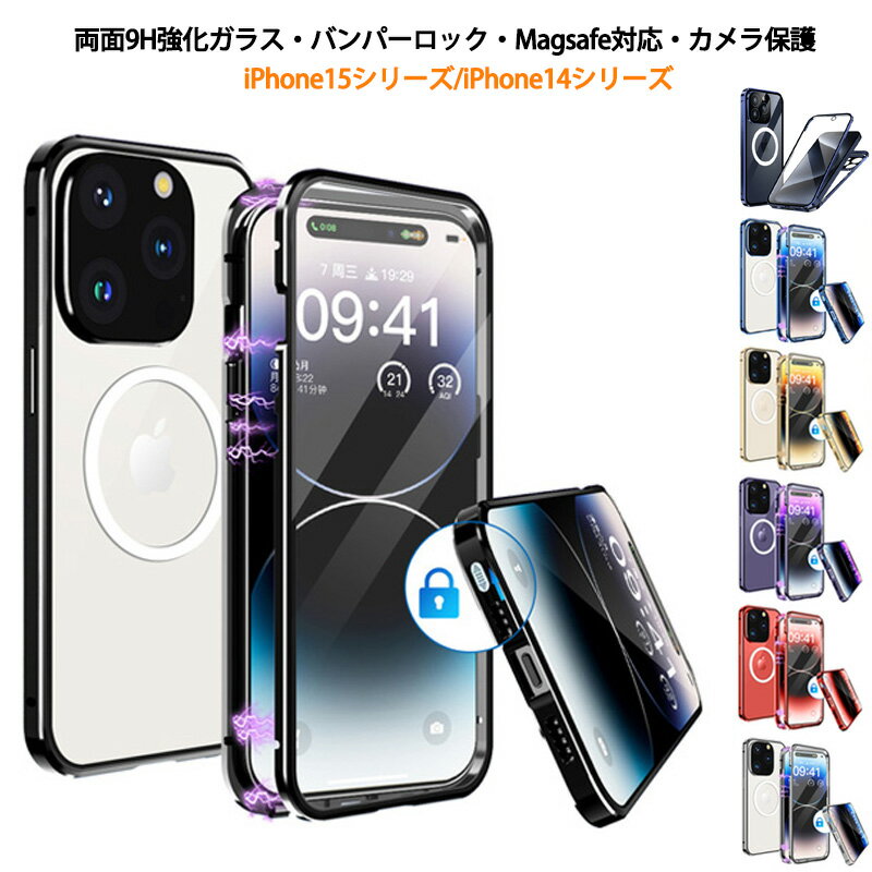 両面ガラス バンパーロック Magsafe対応 iPhone15 15Plus 15Pro 15ProMax iPhone14 14Plus 14Pro 14ProMax ケース 全面保護 両面 9H強化ガラス 透明 カバー アルミバンパー アイフォン15 15プロ マックス アイフォン14 14プラス 14プロ クリアケース カメラ保護 フルカバー