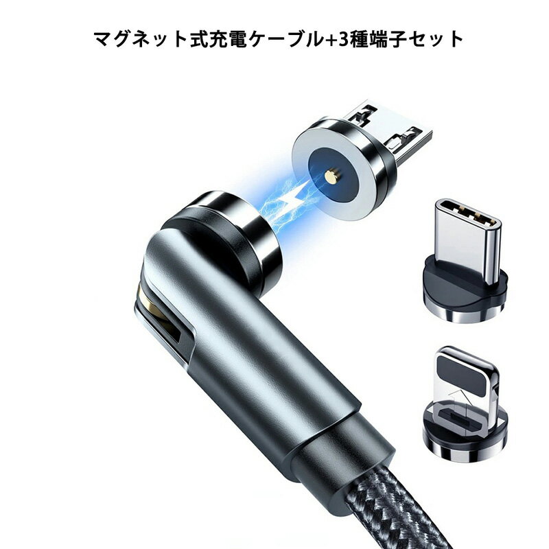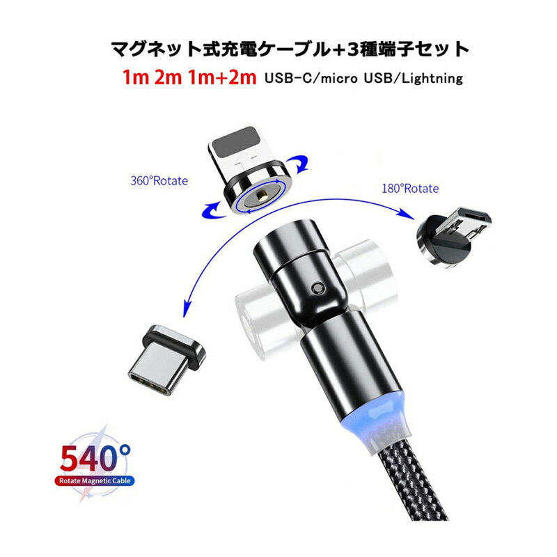 L字型+ストレート型 LED マグネット 充電ケーブル 端子 セット 3in1 540°回転 Lightning iPhone Micro USB Type-C 充電 ケーブル ナイロン Xperia Galaxy ASUS Sony HUAWEI Samsung Android MicroUSB マイクロ ライトニングケーブル タイプC マイクロUSB
