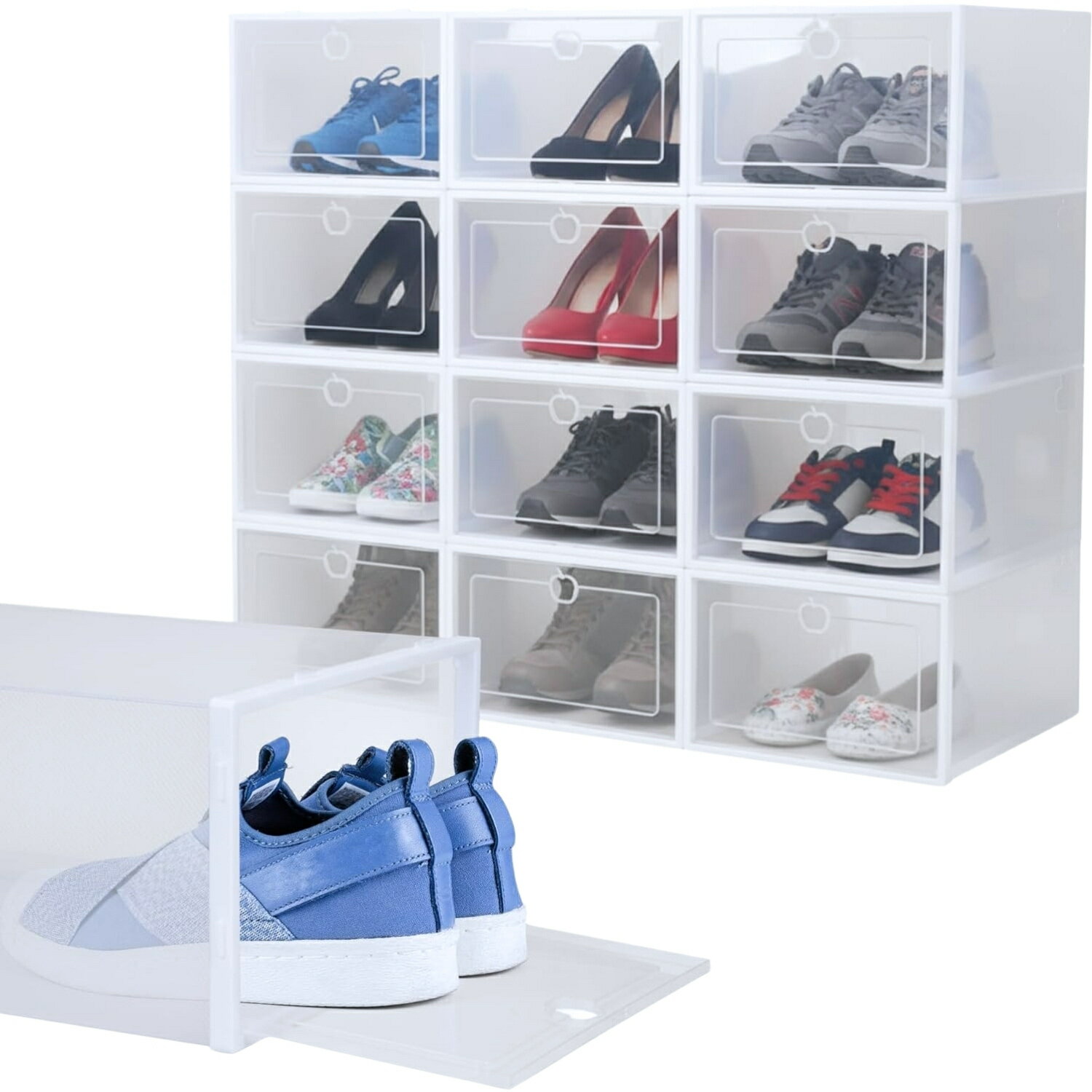 \10%OFFクーポン & お買い物マラソン!/ 【12個セット/大容量】 シューズボックス スリム クリア 折りたたみ 靴箱 収納 33x23x14cm プラスチック透明 防塵 通気 スタッキング シューズケース 靴入れ 下駄箱 玄関収納 スニーカー 革靴 ハイヒール 男女兼用 組立簡単