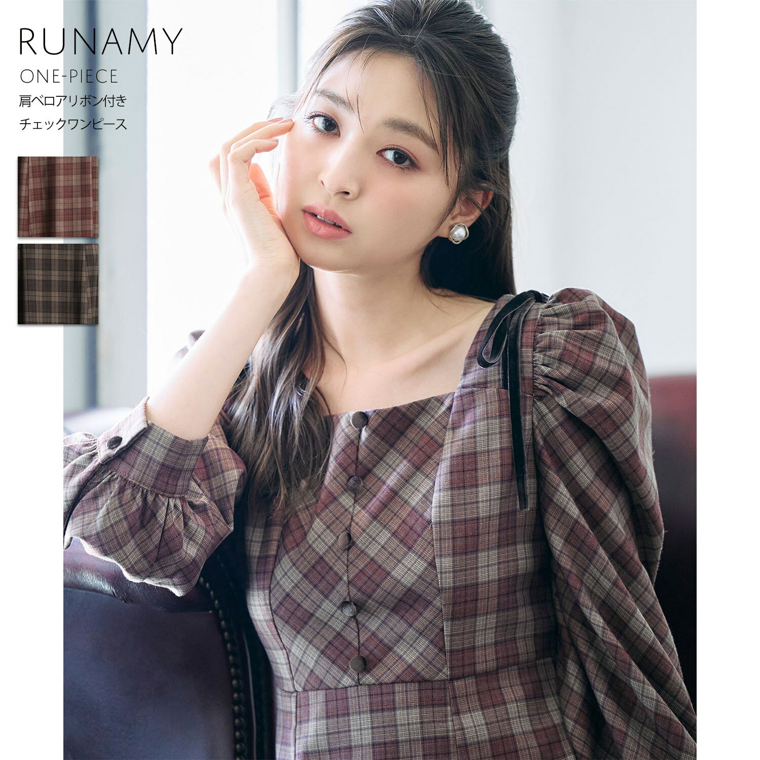 肩ベロアリボン付きチェックワンピース【runamy ルナミー】tocco closet(トッコクローゼット)※上西星来さんはバーガンディーブラウン着用 バーガンディーブラウン ダークブラウン 商品番号:186-200003