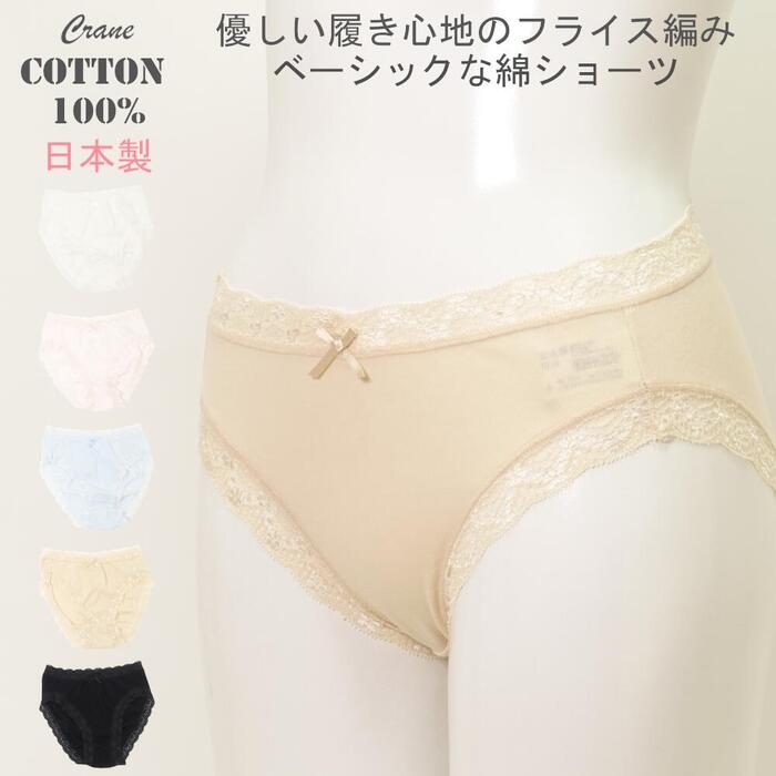 綿 スタンダード ショーツ 日本製 綿95% フルバック シロ 赤 ストレッチ レディース メール便 コットン 下着 普通丈 パンツ レース リボン デイリー 単品 スタンダードショーツ おしゃれ 安心 白 アカ 安全 日本製 M L Crane クレイン 綿ベア天