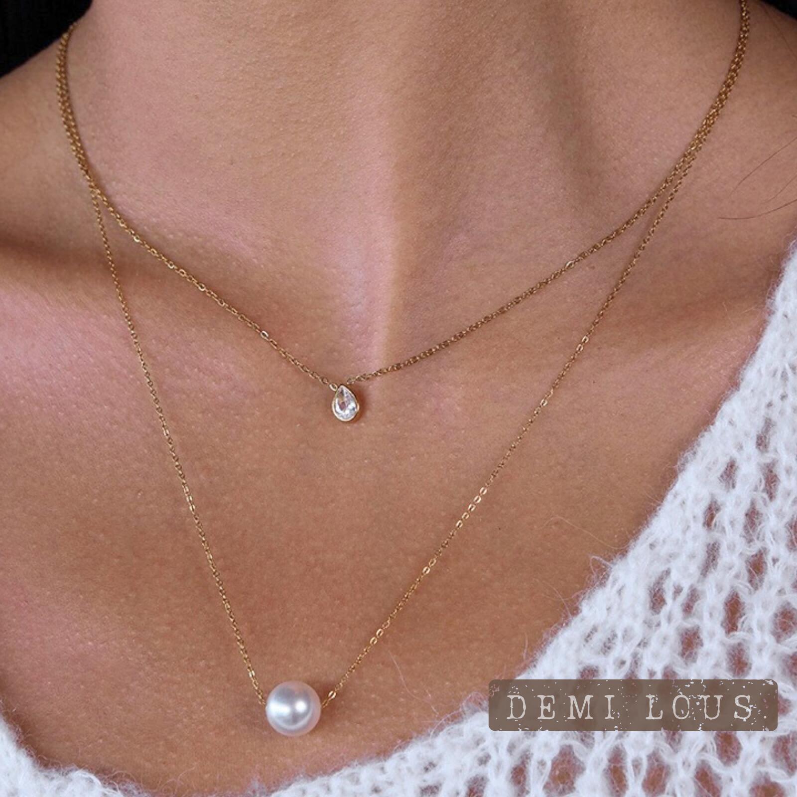 2連レイヤードネックレス ジルコニア&パールペンダント 轻奢な上品デザインで日常から特別な日まで使える華奢見せネックレス