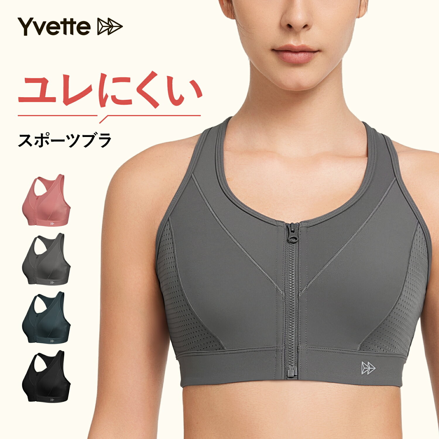 Yvette(イベット) ブラジャー スポーツブラ ノンワイヤー 前開き しっかり ハイサポート 揺れない レディース フロントファスナー付き 着脱簡単 下着 後ろホックタイプ フィットネスブラ 高通気性 吸汗速乾 ランニング用 登山用 ゴルフ ブラ ジッパー