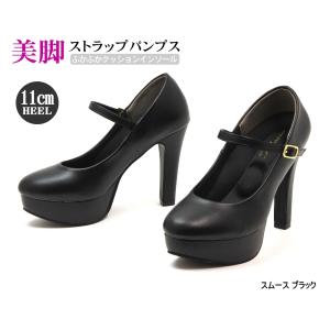 11cmヒール ふかふかクッション ストラップ プラットフォームパンプス ブラック スムース