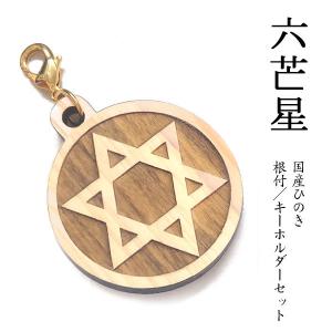 【NEW】六芒星 国産ヒノキ 彫刻 国産ヒノキ 彫刻 根付&キーホルダーセット / 木 天然 日本産 ひのき 檜 ストラップ 金色 ゴールド 丸 ラウンド