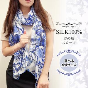 シルクスカーフ シフォン シルク100% 春の鳥 白地×青柄 鳥 植物 プリント 上品 大判 小判 正方形 長方形 レディース ストール ショール 春夏秋冬
