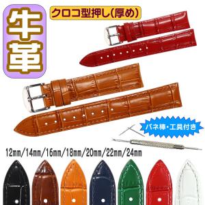 時計ベルト 牛革 ワニ皮型押し 厚め バネ棒・交換工具付 時計バンド 12mm 14mm 16mm 18mm 20mm 22mm 24mm メンズ レディース