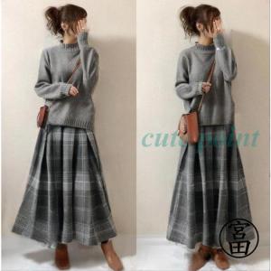 ニット トップス セットアップ ハイネック レディース ロングスカート チェック柄 秋 長袖 体型カバー 秋冬 可愛い 通勤 OL