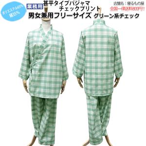 パジャマ業務用 ポリ65% 綿35% 大人用 男女兼用 平織チェックプリント生地 甚平タイプパジャマ上下セット グリーン系チェック 三露産業 病衣 部屋着 ホテル 民泊