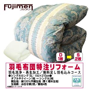 羽毛布団 打ち直しリフォーム シングル(2枚を1枚へ)綿100%生地 超長綿60サテン/羽毛洗浄再生込み料金・羽毛洗浄クリーニング