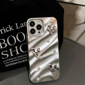 iPhoneケース 韓国 メタリック シルバー ハート 立体 かわいい おしゃれ ウェーブ パール おしゃれ X XS 11 12 13 15 耐衝撃