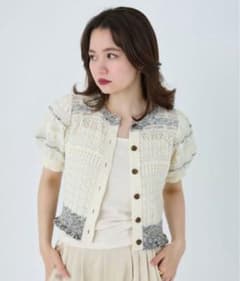 NOUESPAZIO ファーカーディガンブラックビーズ装飾花柄長袖アンゴラM秋冬