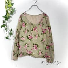 スーパーハッカ カットソー(M相当)花柄 総柄 カーキ ピンク 薔薇 大人可愛い