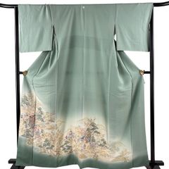 色留袖 身丈161.5cm 裄丈66cm M 袷 源氏の宴 御所車 人物 金糸 ぼかし 灰緑 正絹 秀品 一つ紋 【中古】