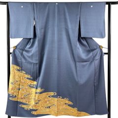 色留袖 身丈153cm 裄丈63.5cm S 単衣 流水 菊 金糸 金彩 青灰色 正絹 秀品 三つ紋 【中古】