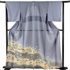 色留袖 身丈160cm 裄丈65cm M 薄物 絽 落款 鶴 松 ぼかし 金銀彩 青灰色 正絹 秀品 一つ紋 【中古】