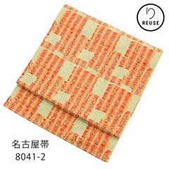 名古屋帯 正絹 リユース 中古 ふくれ織 赤色 幾何学文様 モダン 縞 ボーダー 8041-4 八寸名古屋帯 洒落帯 カジュアル 普段着