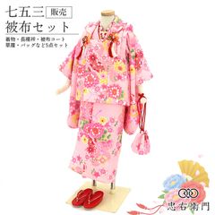 七五三 着物 3歳 女の子 被布セットピンク パステルカラー 鞠 花 桜 ファンシー 身丈92.5cm 裄丈40.5cm 三歳 三才 女児 被布コート 草履 巾着 付き キッズ 和装 お祝い 晴れ着