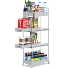 SPACEKEEPER キッチンワゴン 隙間収納 スリム 22cm 収納カップ 仕切板付き 多機能 小物 食品 調味料 キャスター付き 組立簡単 浴室 台所 冷蔵庫横 4段 グレイ (引き出し式)wb