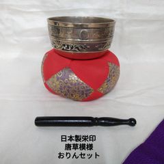 仏具【 日本製 唐草模様おりん3点セット】 音の職人がたたいて作るおりんで、美しい音色が特製です。3寸家庭向き中古3点セットR539