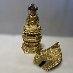 展示品 柘植製 釈迦如来座像2.5寸新六角唐草後背金泥描き