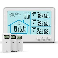 デジタル温度湿度計 室内/室外 ワイヤレス温湿度計 外気温湿度 3つセンサー 天気予報/気圧表示/LCD大画面/バックライト/最高最低温湿度/快適レベル/温度と湿度傾向図表示/置き掛け両用 ホームオフィス温室倉庫使用