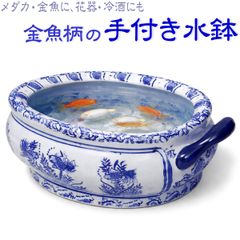 本州/四国送料無料★メダカ鉢 金魚鉢 陶器 手付き 双耳 染付 金魚柄 睡蓮鉢 水鉢 水盤 花器 ワインクーラー 冷酒クーラー 骨董風 説明書付き