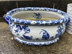 本州/四国送料無料★メダカ鉢 金魚鉢 陶器 手付き 双耳 染付 金魚柄 睡蓮鉢 水鉢 水盤 花器 ワインクーラー 冷酒クーラー 骨董風 説明書付き
