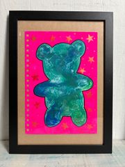 一点物原画 アクリル画 蛍光 ピンク 緑 クマ 黒 額縁 ポップ サイケ インテリア アート 額装済み 可愛い おしゃれ