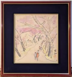 【真作】絵画 日本画(色紙) 桜並木と人々 風景スケッチ 春の散策路 Y154