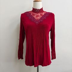 Mサイズ レッド レースフリンジトップス長袖 社交ダンス ラテン スタンダード