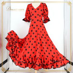 フラメンコ 衣装 フロッキー水玉模様 二重 大判フリル ワンピース ドレス