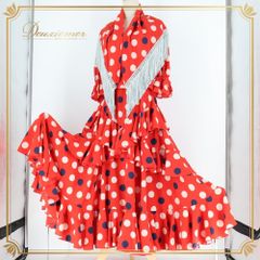 フラメンコ 衣装 ツーピース セットアップ 上下セット ホワイト系 レッド系 ネイビー系 赤 白 紺 トップス ブラウス ファルダ スカート シージョ 水玉 ドット フレコ フリンジ ダンス パーティ 発表会 ステージ衣装 パーティー衣装 おしゃれ ドット