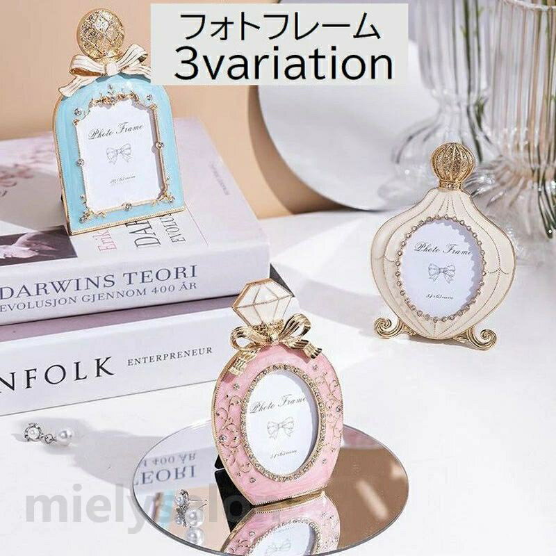 送料無料 フォトフレーム フォトスタンド 写真立て インテリア小物 雑貨 香水瓶 リボン ラインストーン ゴールドカラー オフホワイト ピンク ブルー おしゃれ かわいい ギフト プレゼント