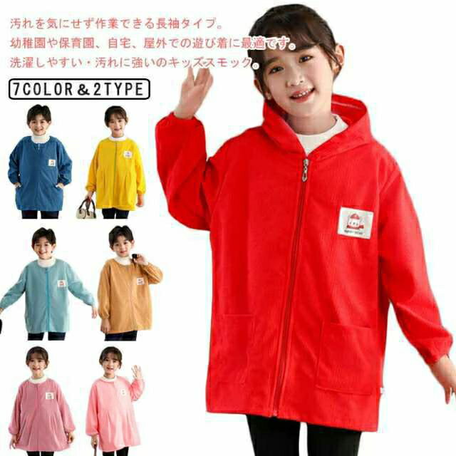 エプロン ジップアップ 長袖スモック 撥水加工 スモック 長袖 無地 小学生 プレイウェア コーデユロイ エプロン スモック 前開き