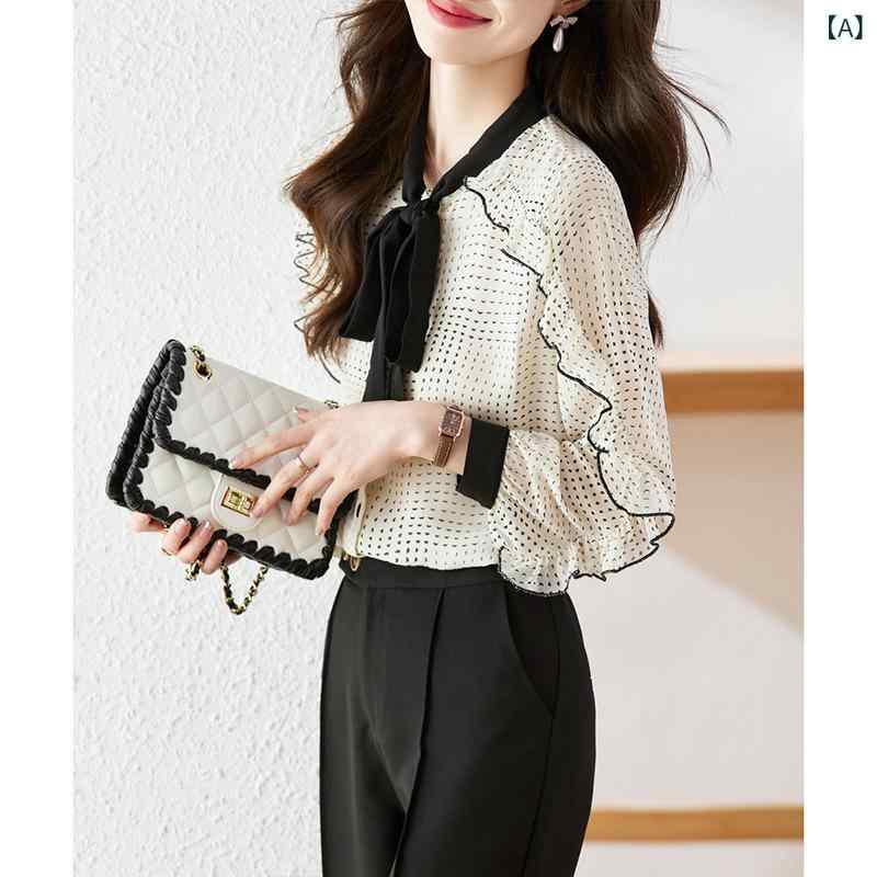 ブラウス レディース シフォン ポリエステル リボン デザイン ラウンドネック フリル袖 長袖 ゆったり ミドル丈 高級感 上品 華やか 若見え きれいめ オフィス 通勤 春夏 トップス
