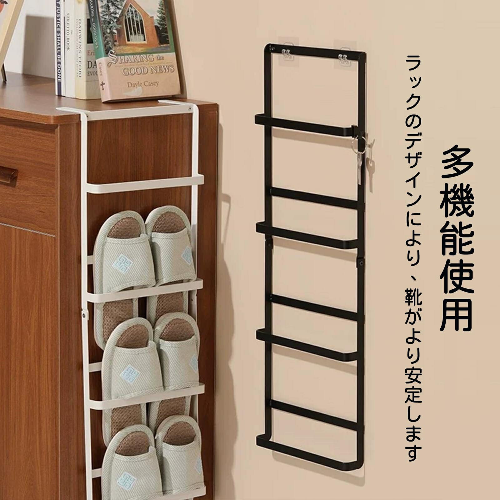 壁掛けスリッパラック 4段 玄関収納 引っ掛け式 シューズラック 取り付け簡単 穴開け不要 省スペース バスルーム/寝室/ホテル対応 ステ