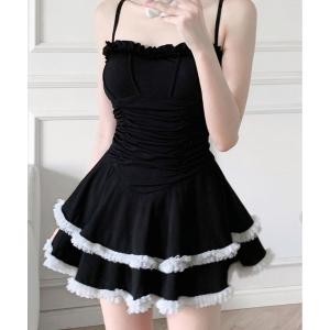 水着 レディース ワンピース オールインワン 体型カバー おしゃれ かわいい 20代 40代 肩出し アシメ 黒 無地 フリルヘム オトナ女子 フレアスカート お洒落