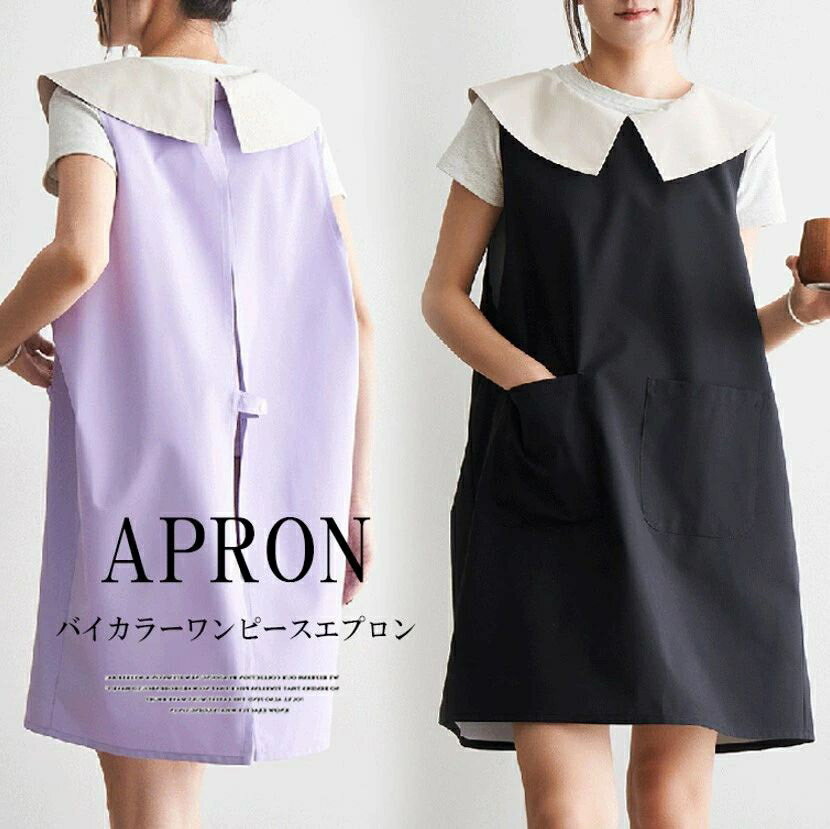 洋服感覚で使えるエプロンドレス!2色展開 エプロン バイカラー 配色 ロング丈 ポケット付き エプロンワンピース カフェエプロン お花屋さん 業務用 レディース お尻が隠れる