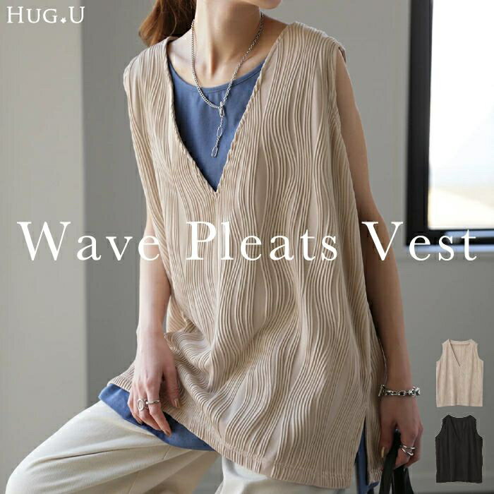 深Vネック スリット ロング トップス ノースリーブ レイヤード レディース チュニック ベスト プリーツ ウェーブ 体型ごまかす」
