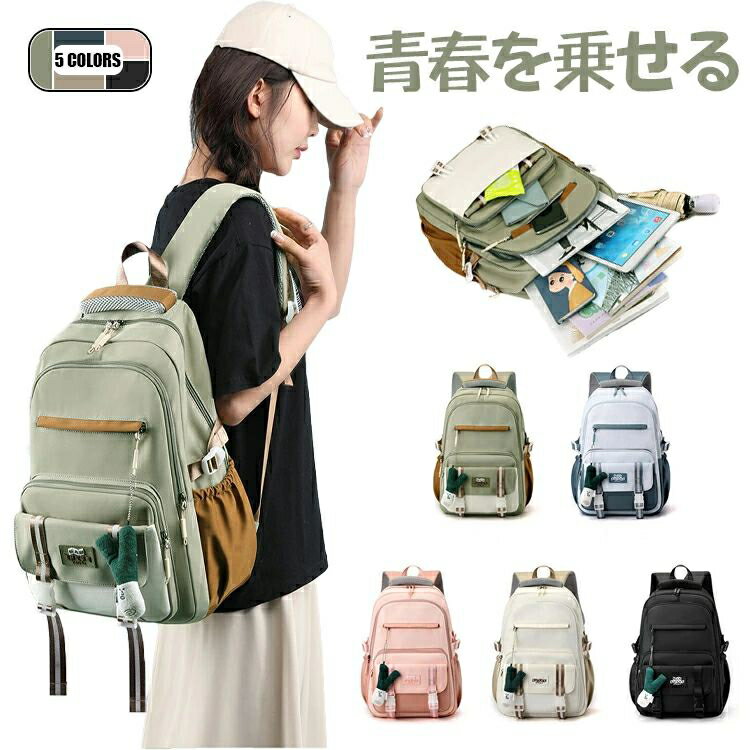 リュック レディース 通学 リュックサック バックパック 通学リュック チャーム付き 肩掛け 通勤バッグ 男女兼用 ナイロン 大容量 軽量 黒 ベージュ ピンク 赤 防水 a4 韓国 人気 おしゃれ かわいい 多機能 通勤 中学 高校 高校生 旅行 収納力抜群 シンプル ナイロン