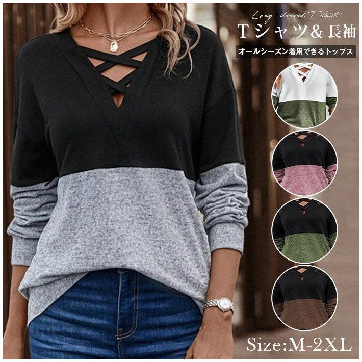 M 婦人服 カジュアル 通勤 L カットソー 3L ルームウエア レディース Vネッククロス サイズ豊富 春夏秋冬 長袖tシャツ トップス LL 体型カバー プルオーバー キレイ目 切り替え ドロップショルダー