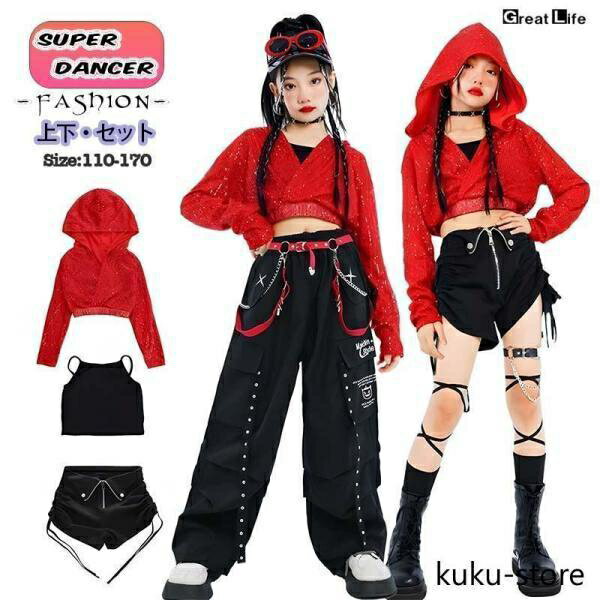 キッズ へそ出し トップス ダンス衣装 女の子 キラキラ 赤トップス セットアップ 短パンツ かっこいい スカート 韓国 k-pop衣装 ヒップホップ ジャズダンス ワイ