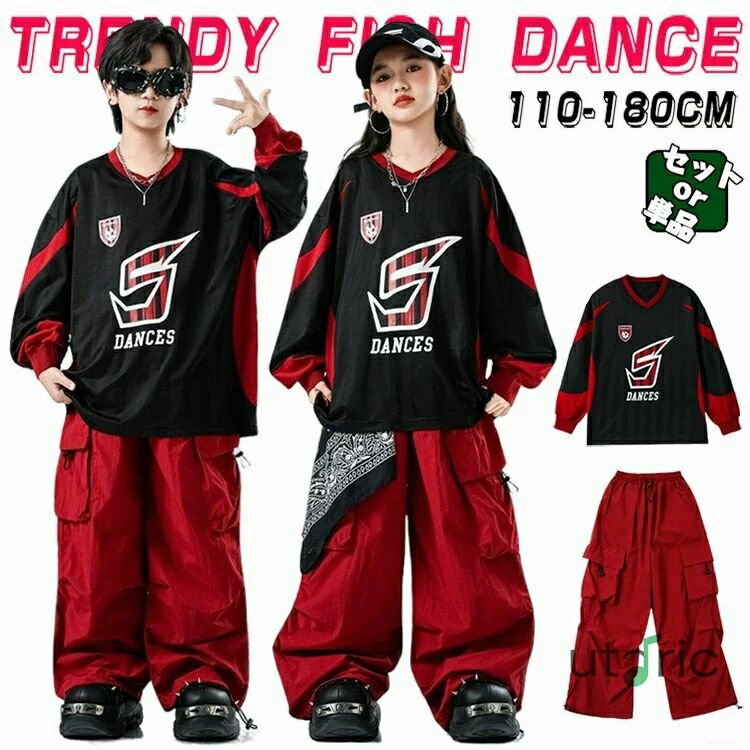 カーゴパンツ キッズ 子供ダンス衣装 ヒップホップ スポーツウェア 女の子 男の子 セットアップ ジャズダンス ストリート ユニセックス ダンスウエア レッド ブラック 長袖 トップス ロングパンツ ゆったり かっこいい 原宿系 発表会 演出服 練習服 団体服 110-180cm