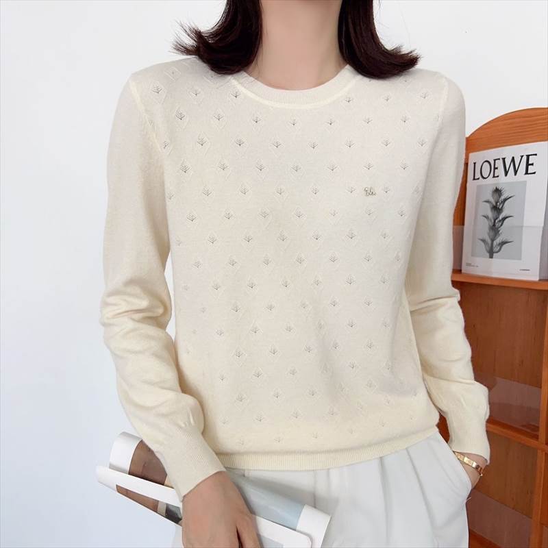 【P2倍&クーポン有】刺繍 クルーネック ニット セーター プルオーバー 秋 冬 普通丈トップス 長袖 Uネック 襟なし ノーカラー クロシェ 編み込み 透かし カラバリあり ブラック ホワイト ベージュ キャメル レッド サーモンピンク ブラウン パープル 柄あり 葉