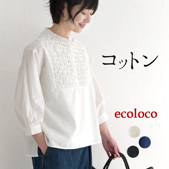 ブラウス 七分袖 レディース コットンポプリン スモッキング刺繍 綿100%/ 着後レビューでクーポン☆ カジュアル シンプル きれいめ シャツ 体型カバー ゆったり トップス 涼しい 大人可愛い 無地 エコロコ e+,/ 春夏 26SS0424R,