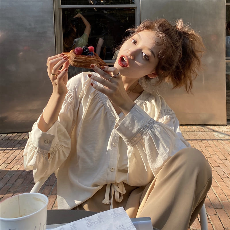 2色 ブラウス Vネック ボリューム袖 レディース シャツ 春