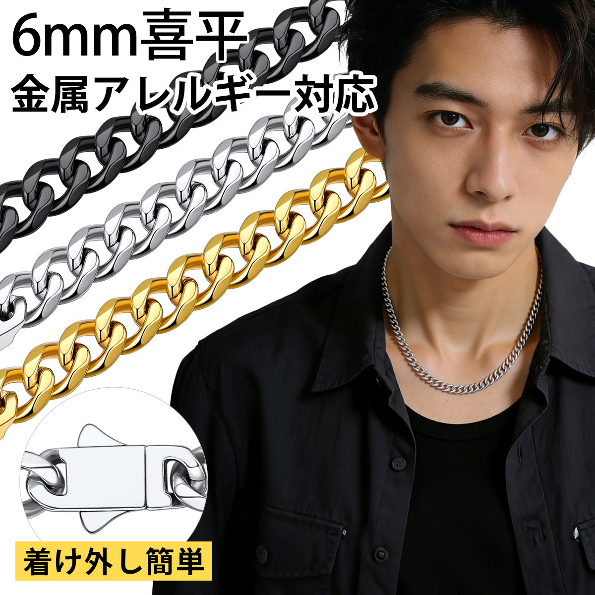 ネックレス メンズ チェーンのみ サージカルステンレス 6面カット 喜平 プッシュ式留め具 着け外し簡単 6mm幅 金属アレルギー対応 つけっぱなし 錆びない シンプル 長さ45cm 50cm 55cm 60cm 65cm 70cm 75cm シルバー ゴールド ブラック 黒