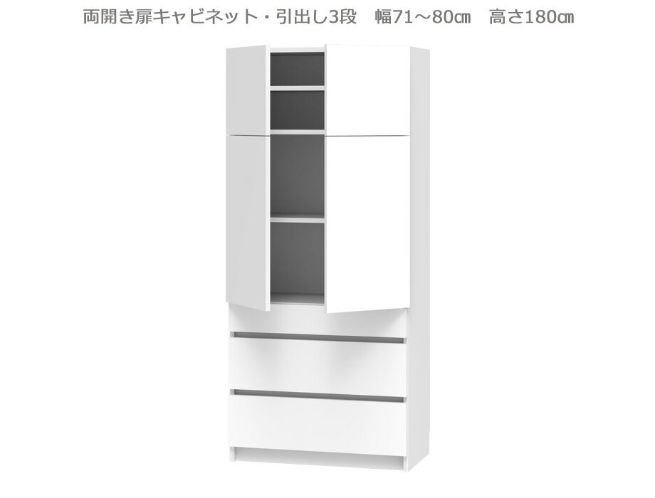 【幅1cm単位でサイズオーダー】セミオーダー壁面収納GRANNER2(グラナー2)両開き扉・引出3段ラック(幅71~80cm×奥行42cm×高さ180cm)全14色|日本製|完成品